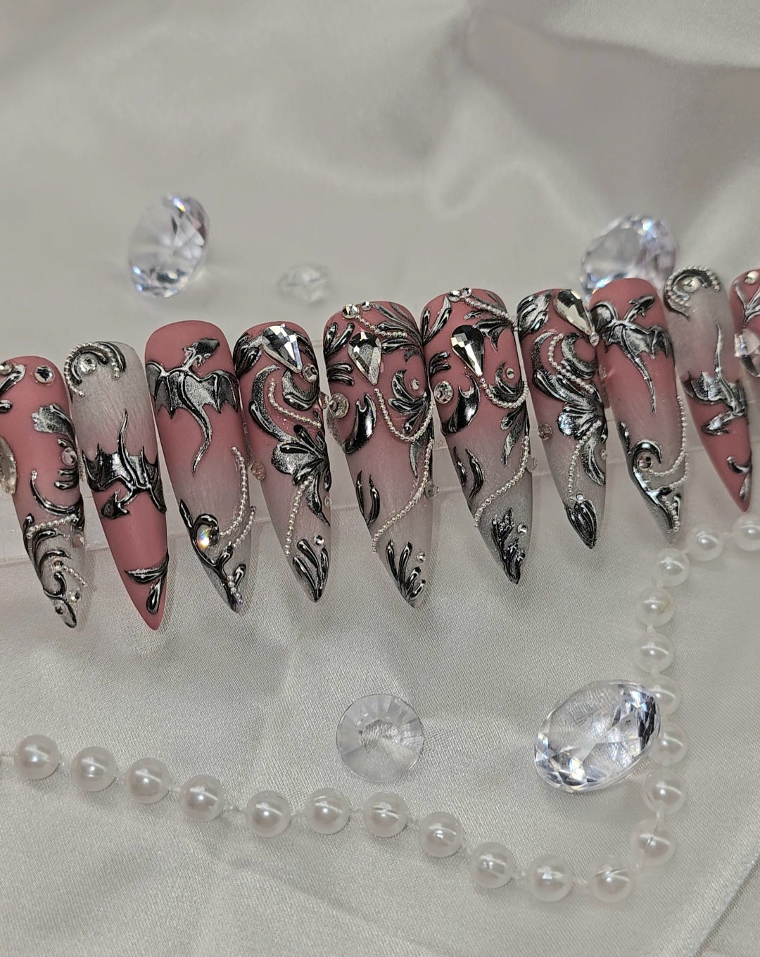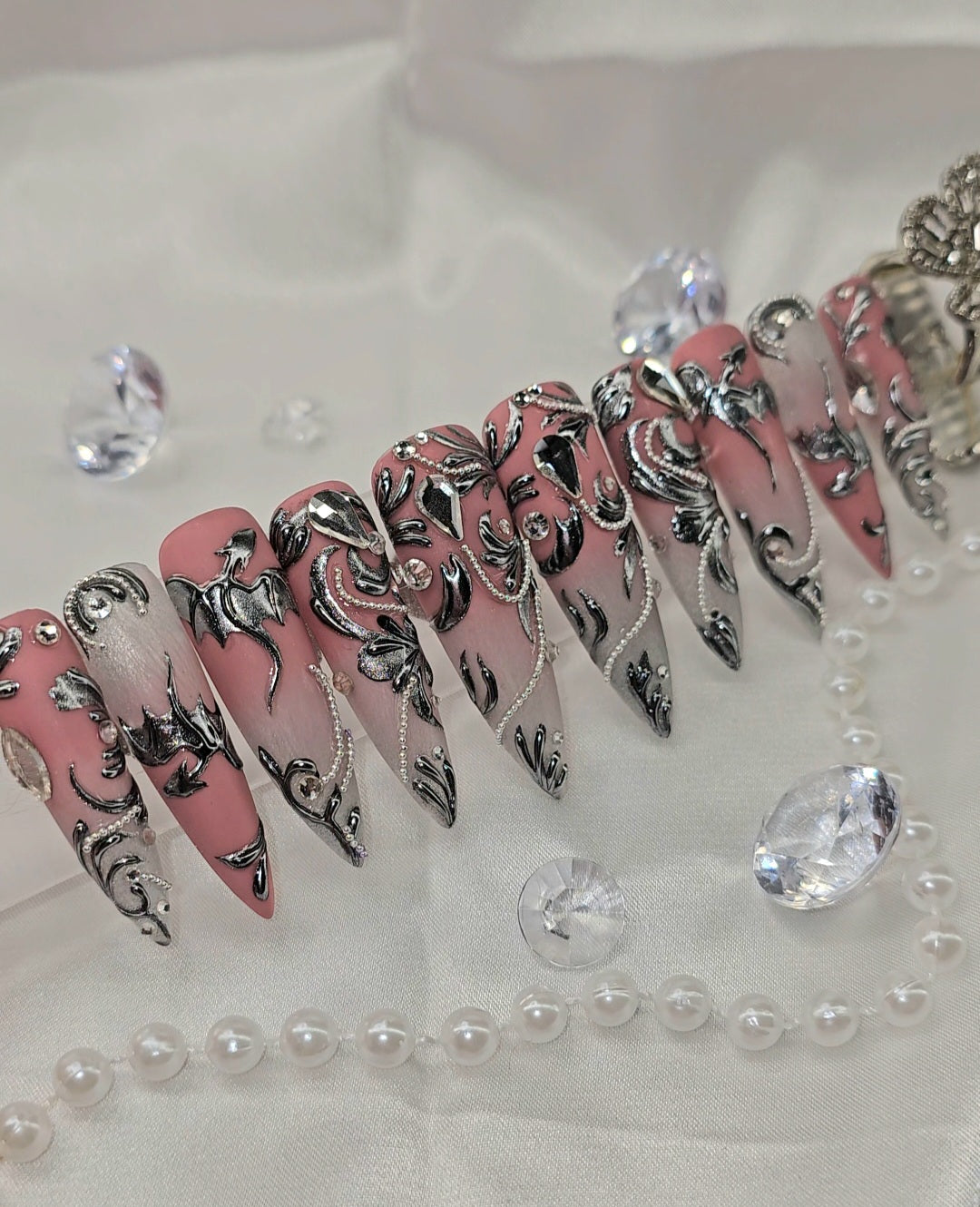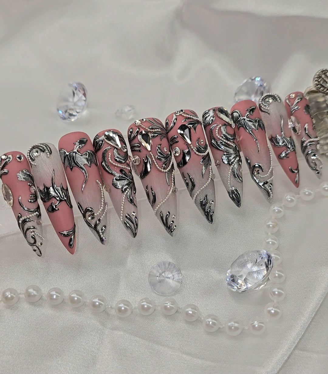 Design may be different depending on the length and shape of nail you choose. Rhinestones may be placed differently, or not added due to the length of nail